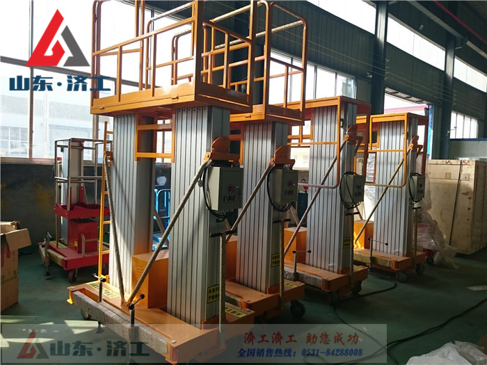 1. 鋁合金式移動升降平臺:設計的新一代產品,采用了新型鋁合金型材,由于型材強度高,使升降臺的偏轉與擺動小。它輕盈的外觀,能在小的空間內發揮高的舉升能力。使單人高空作業變得輕而易舉,可以移動進行作業。